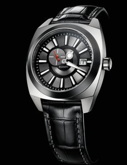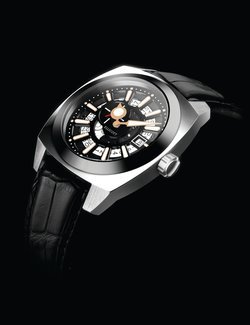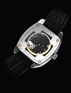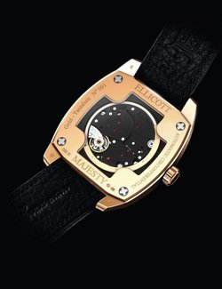 The Majesty watch, created in tribute to King George III, is a worthy heir to the proud English watchmaking tradition, combined here with time-honoured Swiss know-how. Its circumferential rotor guaranteeing a 70-hour power reserve heralds a new era in the field of self-winding movements. The case-back opening highlights the full complexity of this mechanism, while the rounded cushion-shaped case carved from a block of gold or titanium makes a fine contrast with the tantalum or gold case. This timepiece distinguished by an innovative and contemporary design is dedicated to modern gentlemen and issued in a 99-piece limited edition.