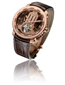The background for DeWitt’s new creation is the majestic New York of the 1930’s, stimulating, prosperous, and characterized by the Art Deco movement and its innovative, modern, aerodynamic lines. Comprising 320 components, the DW8014 calibre expresses the same inventive audacity. The 100% Manufacture DeWitt movement introduces a patented Automatic Sequential Winding (A.S.W.) device driven by a peripheral oscillation rotor. The dial is dominated by an impressive construction whose four columns tower majestically over the tourbillon. The balanced structure of the sunray-decorated dial and the chocolate-brown tones of the sapphire crystal reinforce the exclusive character of this exceptional timepiece. Limited edition of 250.