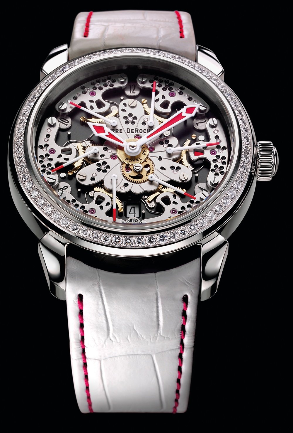 Dedicated to women passionate about fine watchmaking, the GrandCliff Milady Royal Retro is a magnificent interpretation of the original Calibre Royal Retro. The only movement to display six retrograde seconds mechanisms, it presents a fascinating relay of hands as each one takes over the baton. The bridges feature little poetic and floral touches set with diamonds. A watch that women are going to love, either a little, very much, ardently, or to distraction!