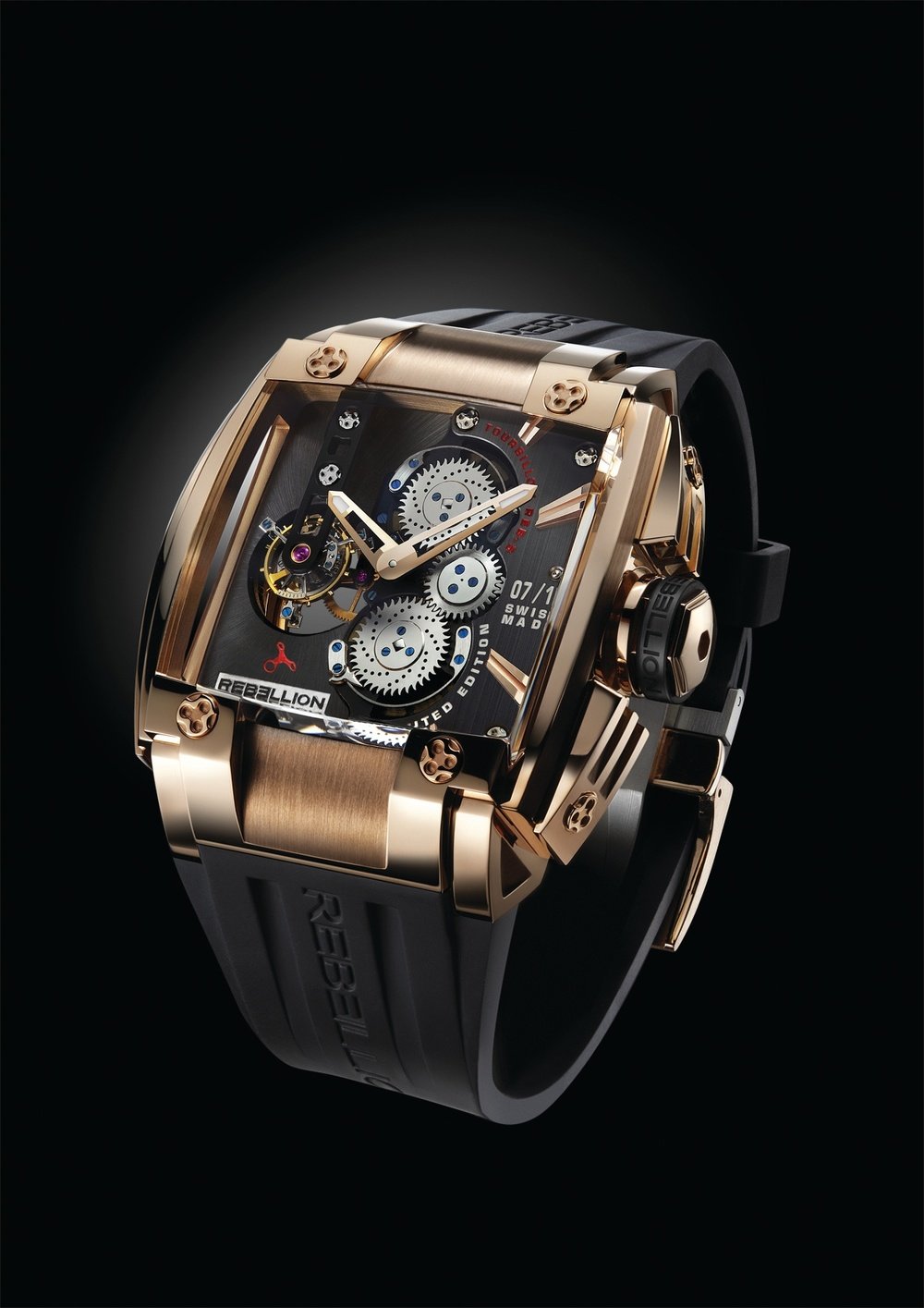 With its REB-5 Tourbillon, this Rebellion timepiece is doubly amazing! While its tourbillon complication is a tribute to Swiss watchmaking, it also represents a real leap forward in 21st century technology. The design talent of Eric Giroud combined with the technical expertise of Laurent Besse has resulted in a unique timepiece. Its originality lies not only in the tourbillon - suspended upright from a bridge - but also in the two visible barrels, which provide a 7-day power reserve. Limited edition of 12.