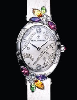This new creation from BijouMontre draws its inspiration directly from the mysterious and magical world of Shakespeare’s play, A Midsummer Night’s Dream. Combining the flamboyant colours of citrine, amethyst, peridot, rhodolite and topaz, the BM 22010T injects new youth into this ethereal tale. Diamond-set (0.9 carat) leaves at centre stage drift across the white mother-of-pearl dial and cascade over the case. Reflecting the exquisite delicacy of absolute femininity, this elegant timepiece is available in a limited edition of 666.