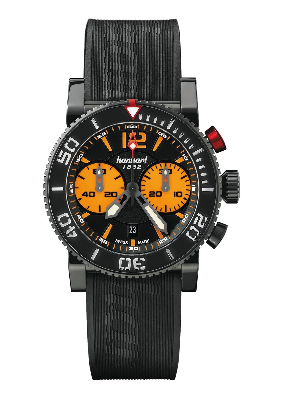 The Primus Diver from Hanhart is in tune with its time. Nevertheless, references to the brand’s past are not lacking. These include its famous red pushpiece, one of the brand’s identifying features since 1939, designed to make the chronograph more user-friendly for fighter pilots, the fluted bezel and the bi-composite dial. The 2011 version of the Primus Diver is clean and cool in its black ADLC-treated case.