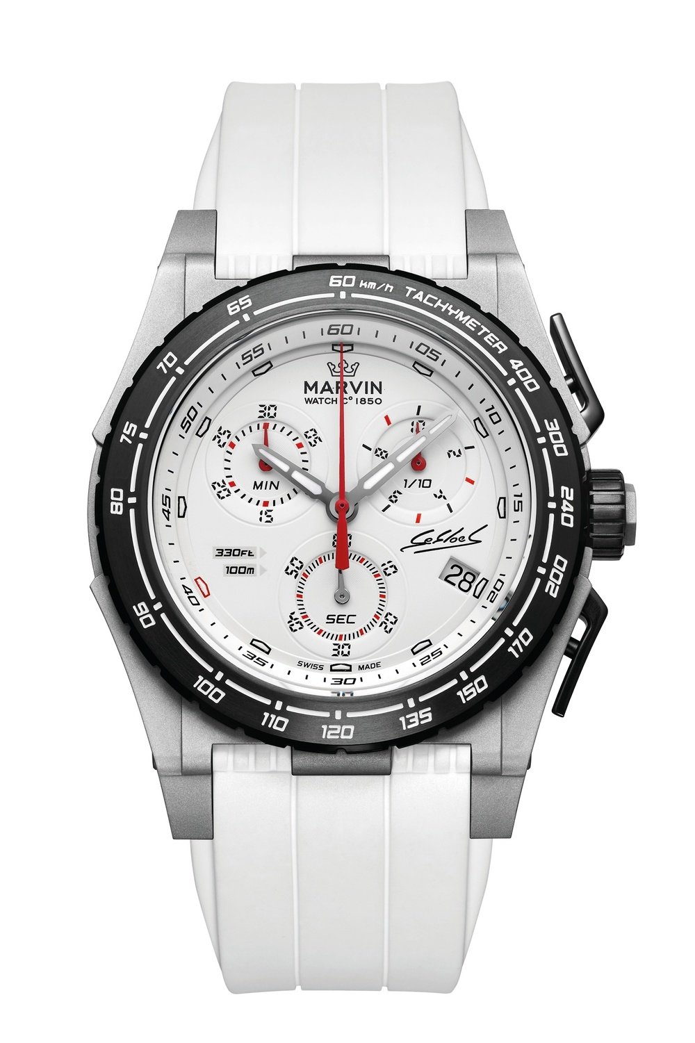 With the Loeb Summer Collection, Marvin underlines the long tradition that links the brand to the passion for car racing. In 1930, it launched the “tyre watch”, a timepiece protected by a rubber tyre. Since 2010, it has worked with Sébastien Loeb, seven-time world rally champion, on a project which reflects his image. Dynamic, vibrantly coloured and high-performing, the chronograph, which is accurate to 1/10th of a second, has a 44 mm case with shaped sides meticulously designed in conjunction with the champion. The dial proudly bears his signature, while the caseback is engraved with his title, “World Rally Champion”.