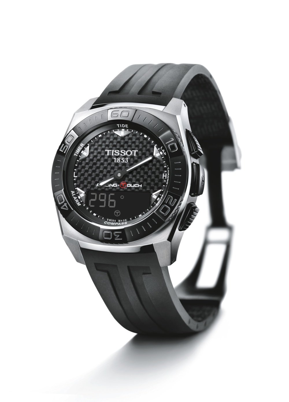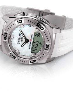 Tissot, the pole-position multi-disciplinary brand, has pulled out all the stops with the Racing-Touch, a model housing no less than 11 functions, all easily accessible via the touch-screen dial. Combining cutting-edge technology and a decidedly modern look, the Racing-Touch is designed for a broad range of sports activities. It has a chronograph, a logbook that memorises results and personal data, a dual time-zone display, two alarms, back-lighting, tide calculator and compass, all available at a touch on the glass. This broad range of technological possibilities is complemented by an equally wide spectrum of colours and combinations that make the Racing-Touch an indispensable accessory for sports enthusiasts.