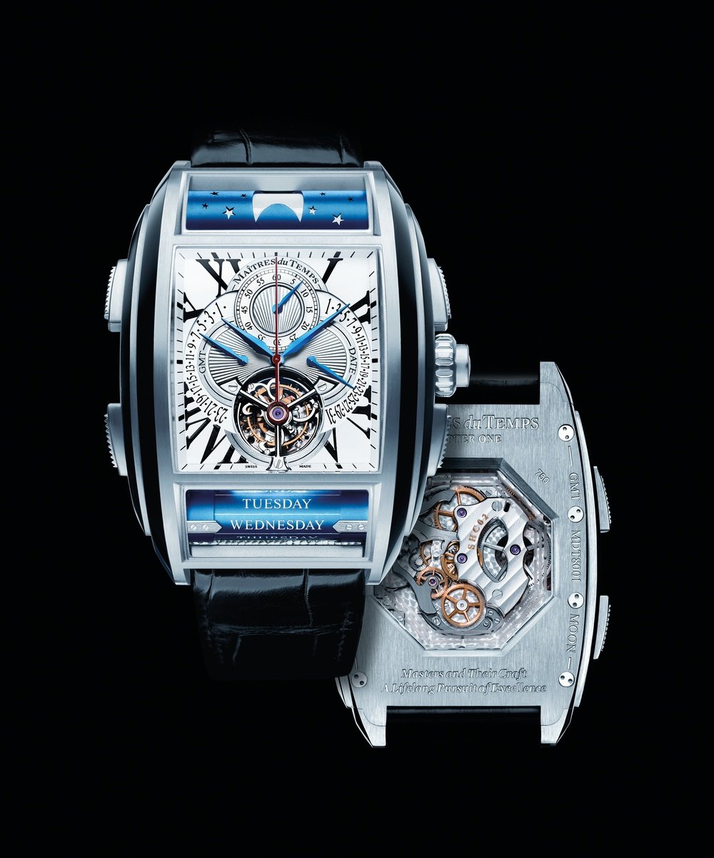 With Chapter One, Maîtres du Temps has achieved an as yet unmatched technical feat: that of uniting a tourbillon, a mono-pusher chronograph, a retrograde date, a retrograde GMT and two separate rollers indicating the day and the phases of the moon respectively. It took the combined talent of Christophe Claret and Peter Speake-Marin, together with the momentum provided by Steven Holtzman, for this youthful brand to revolutionise the world of grand complications.