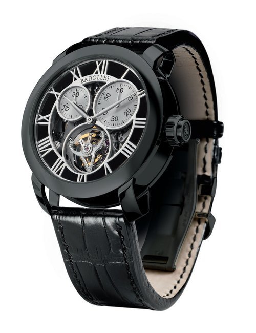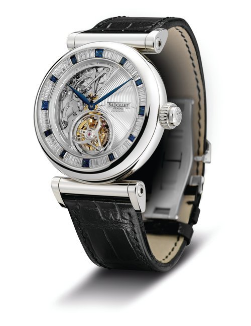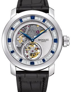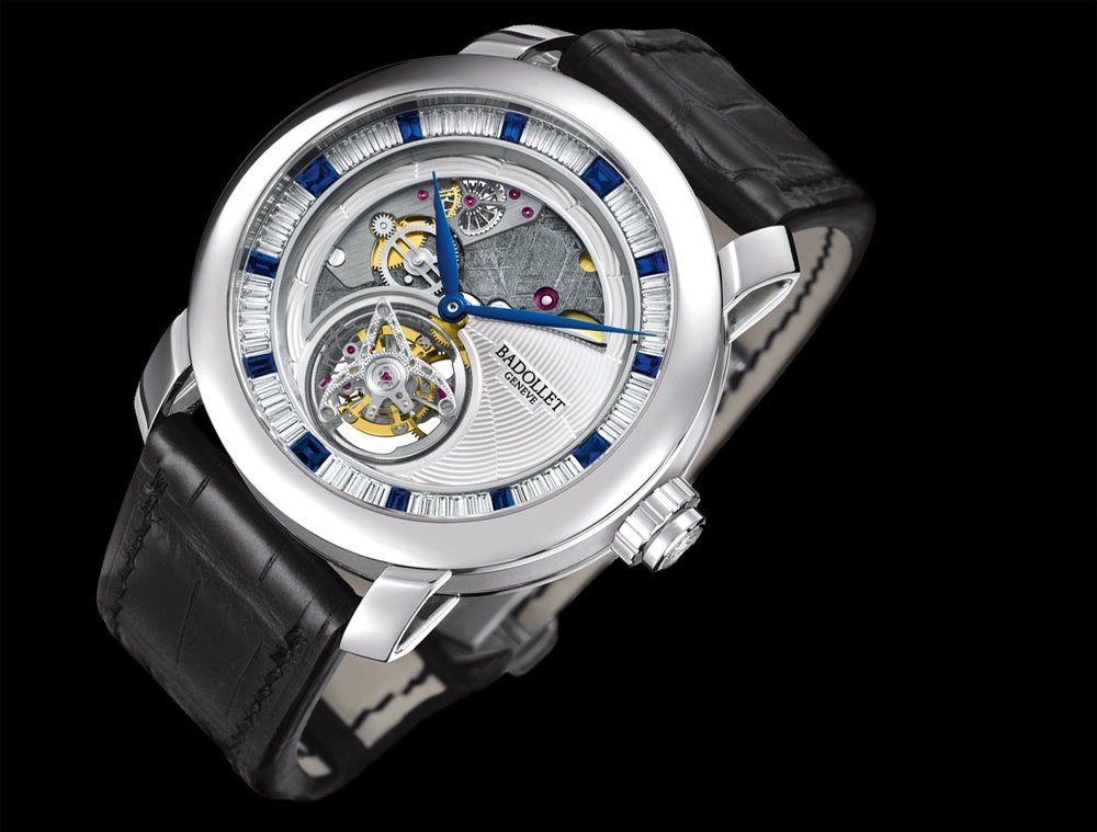 Hand-wound, BAD1630 calibre with flying tourbillon, 13¼ lignes, 21,600 vib/h, 120-hour power reserve; meteorite plate and upper bridge of the tourbillon carriage set with olivines.