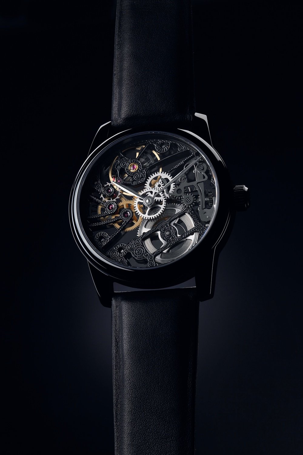 Hand-wound, Unitas 6497 calibre, 16½ lignes, 18,000 vib/h, 17 jewels, 42-hour power reserve, black ruthenium-treated finish, entirely openworked and engraved by hand
