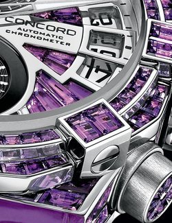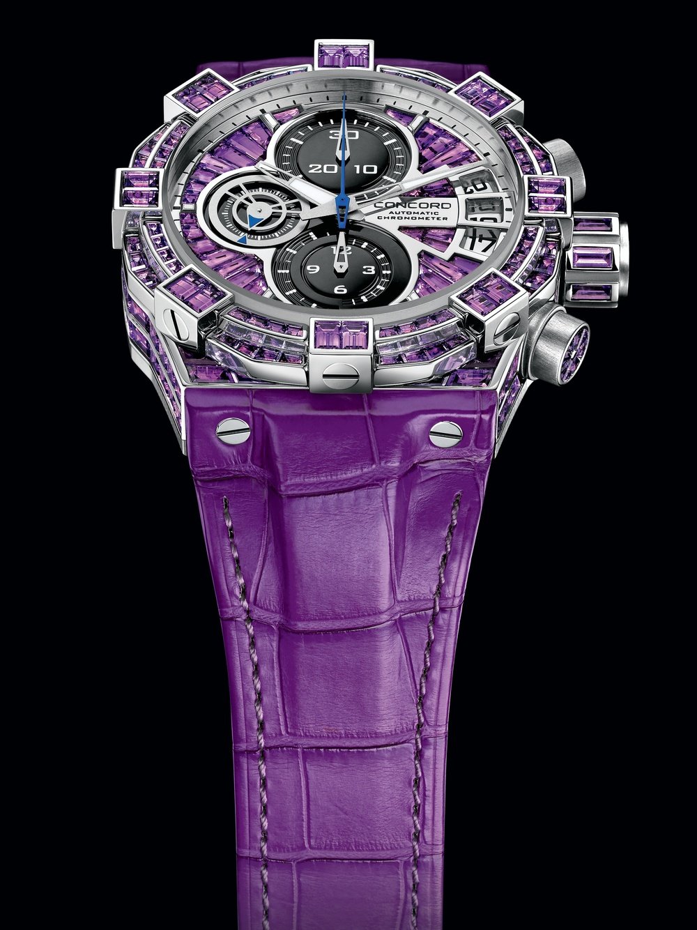 This year, Concord presents yet another stunning creation, the C1 Chronograph Amethyst. This ultimate haute joaillerie watch features 217 baguette-cut amethysts totalling 13.80 carats. The crown, pushpieces, buckle, case, bezel and, of course, the raised ring – the signature feature of the model – are thus adorned in sparkling shades of mauve. With its soft yet clear-cut lines, rounded curves and baguette-cut gems, smooth coherence and singular design, this chronograph vividly evokes femininity in all its splendour and complexity.