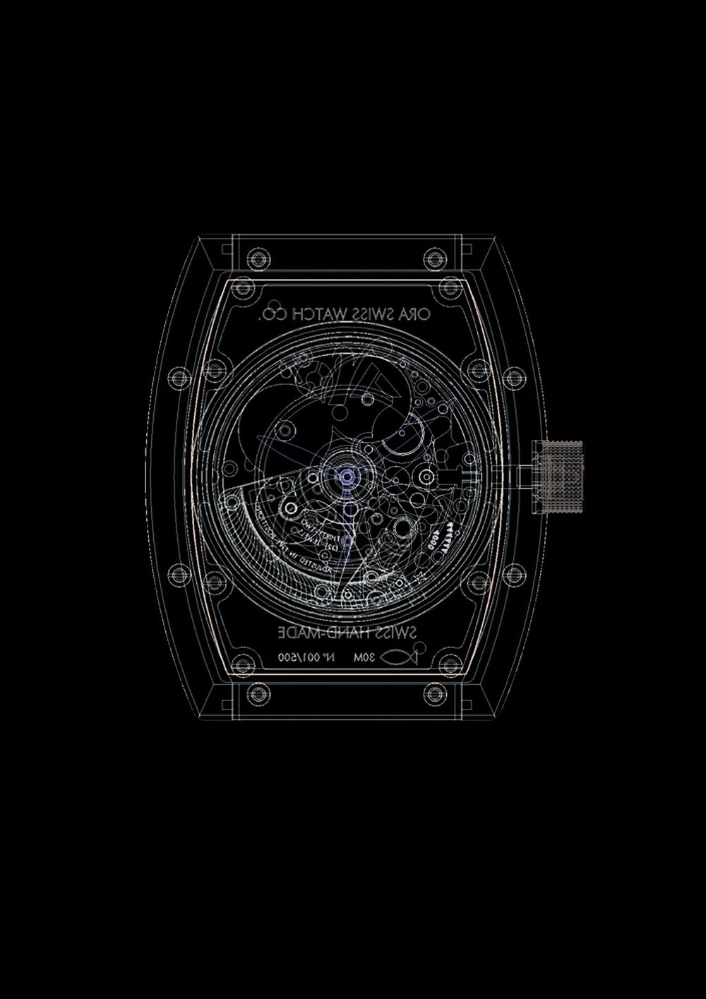 Automatic, Ora P100.2 calibre, 32 jewels, double barrels, tungsten monoblock rotor, ceramic ball bearings, treated plates, circular-grained, chamfered gear trains