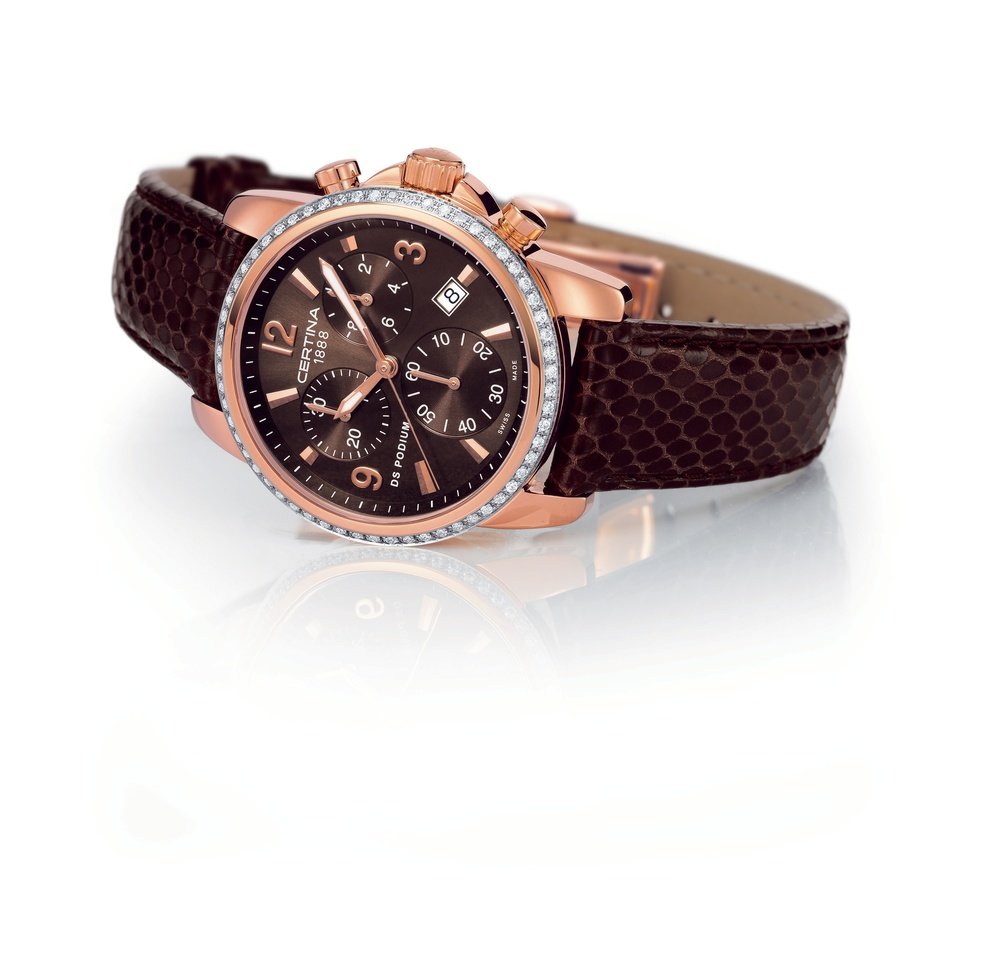 Certina’s latest creation is proof that a chronograph can be feminine. Elegant and functional, the DS Podium has everything for today’s active woman, who will be instantly drawn to its irresistible pink gold PVD steel case, superb sunray satin-finished chestnut-brown dial and the 60 scintillating Top Wesselton diamonds that adorn its bezel. Once again, Certina has successfully combined an avant-garde design with delicate finishing to create a sporty timepiece that will be a must for women.