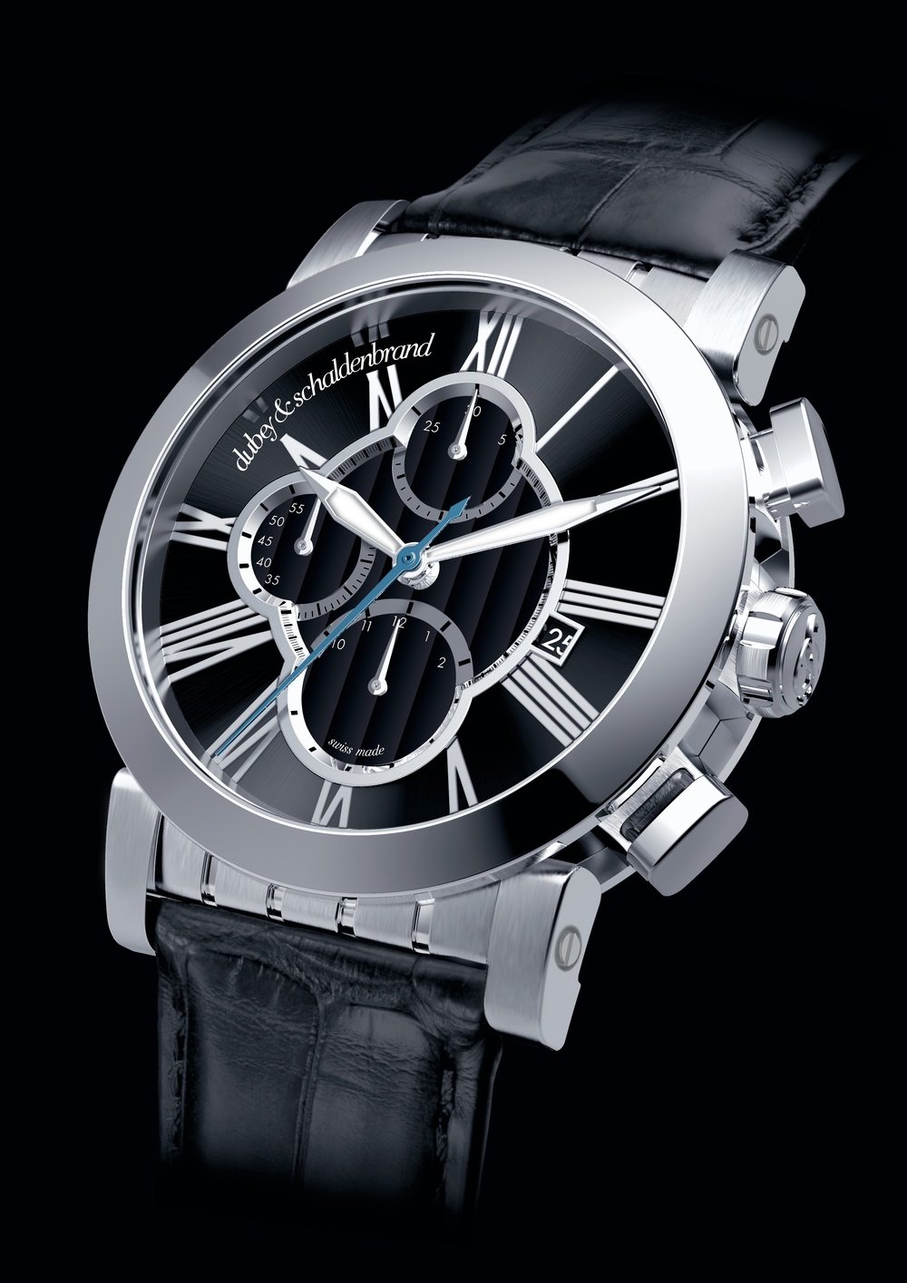 The Grand Shar DB is immediately captivating, but only on closer inspection does the brand’s characteristic attention to detail become evident. A chronograph movement with state-of-the-art finishing, a sculptural case, pushpieces and horns with alternating polished and satin finishing, and a dial of contrasting volumes with recessed counters flanked by large elongated Roman numerals. Every detail is another testimony to Dubey & Schaldenbrand’s expertise.