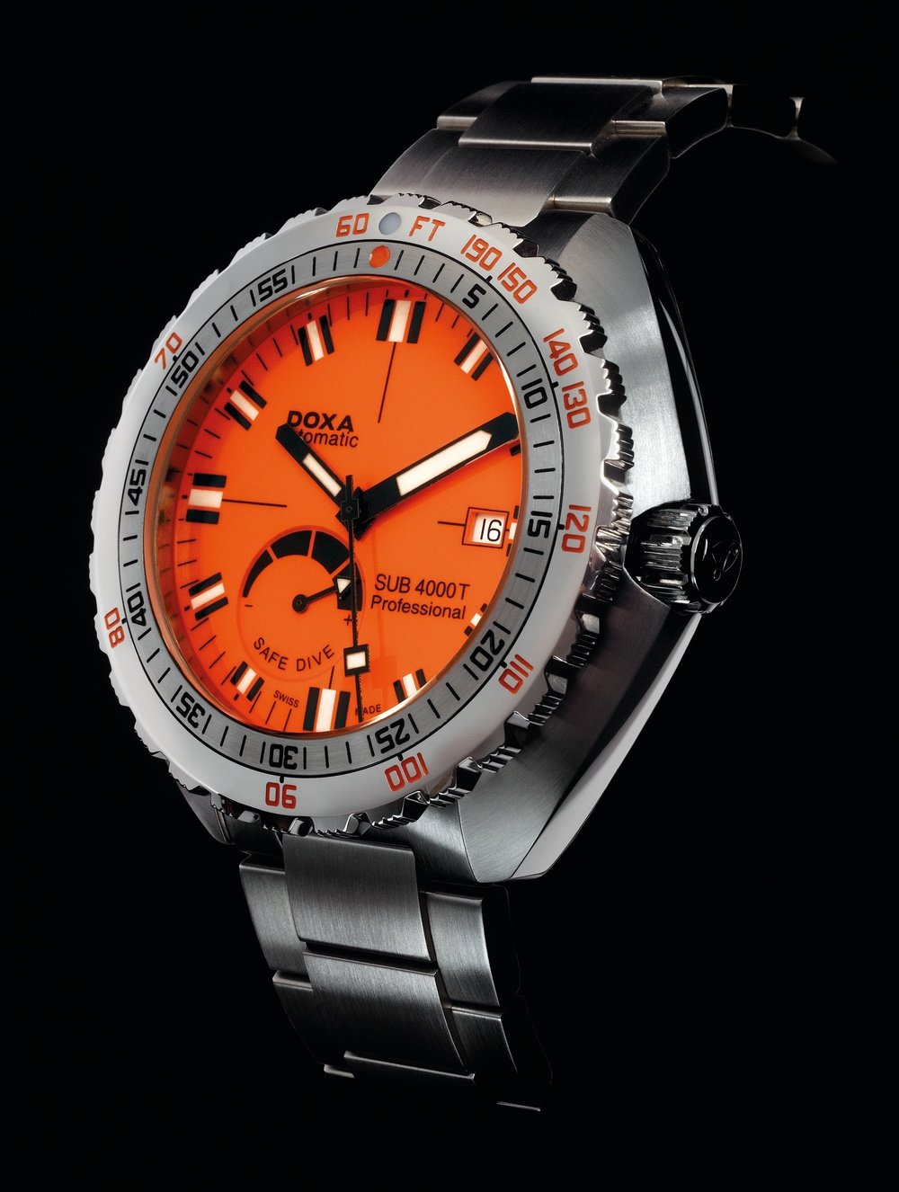 The new Doxa SUB 4000T, a professional diver’s instrument designed for the most exacting conditions, commemorates the tenth anniversary of the Doxa SUB collection. The hands and hourmarkers offer unparalleled luminosity, the rotating bezel indicates the decompression table, and the helium valve at 9 o’clock guarantees water-resistance to a depth of 1,220 metres. Dedicated to ocean-diving enthusiasts, this edition is limited to 500 pieces.