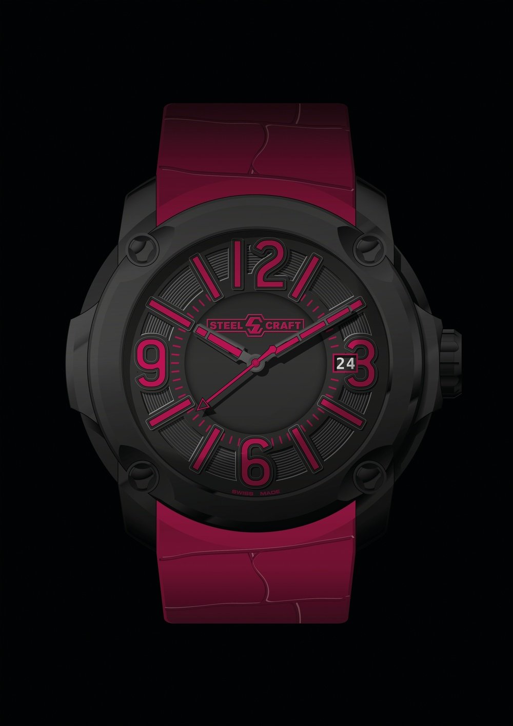 The New Lady Colors collection expresses the will to reinforce the Steelcraft lady models’ sex appeal with more impetuous and cleaner lines. Always colorful, the look is “punchy chic” but with no affectation. The brightly made-up black PVD cases reflect feminity’s voluptuous side. As a bonus, the designer’s very own touch : the “crocodile structure” rubber strap, worth a bite !