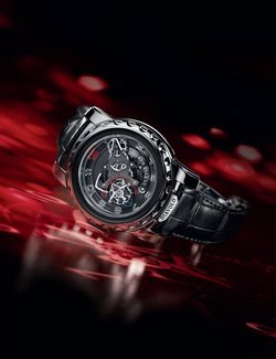 The Freak Diavolo follows in the footsteps of the iconic Freak that revolutionized the watchmaking world and incorporates the latest advances in technology, materials and concepts. While the carousel tourbillon, acting as a minute indicator, makes one complete rotation an hour, a flying tourbillon sits above the carousel. Its cage, which makes one revolution a minute, is equipped with an arrow indicating the seconds on a semi-circular dial. Technically impressive with its extended use of silicium, the Freak Diavolo is also extremely attractive with its clean lines, black and charcoal tones, hints of colour and white gold case. The ultimate symbol of unbridled imagination and elegant originality, the Freak Diavolo is faithful to the spirit of inventiveness that defines both this collection and the brand.