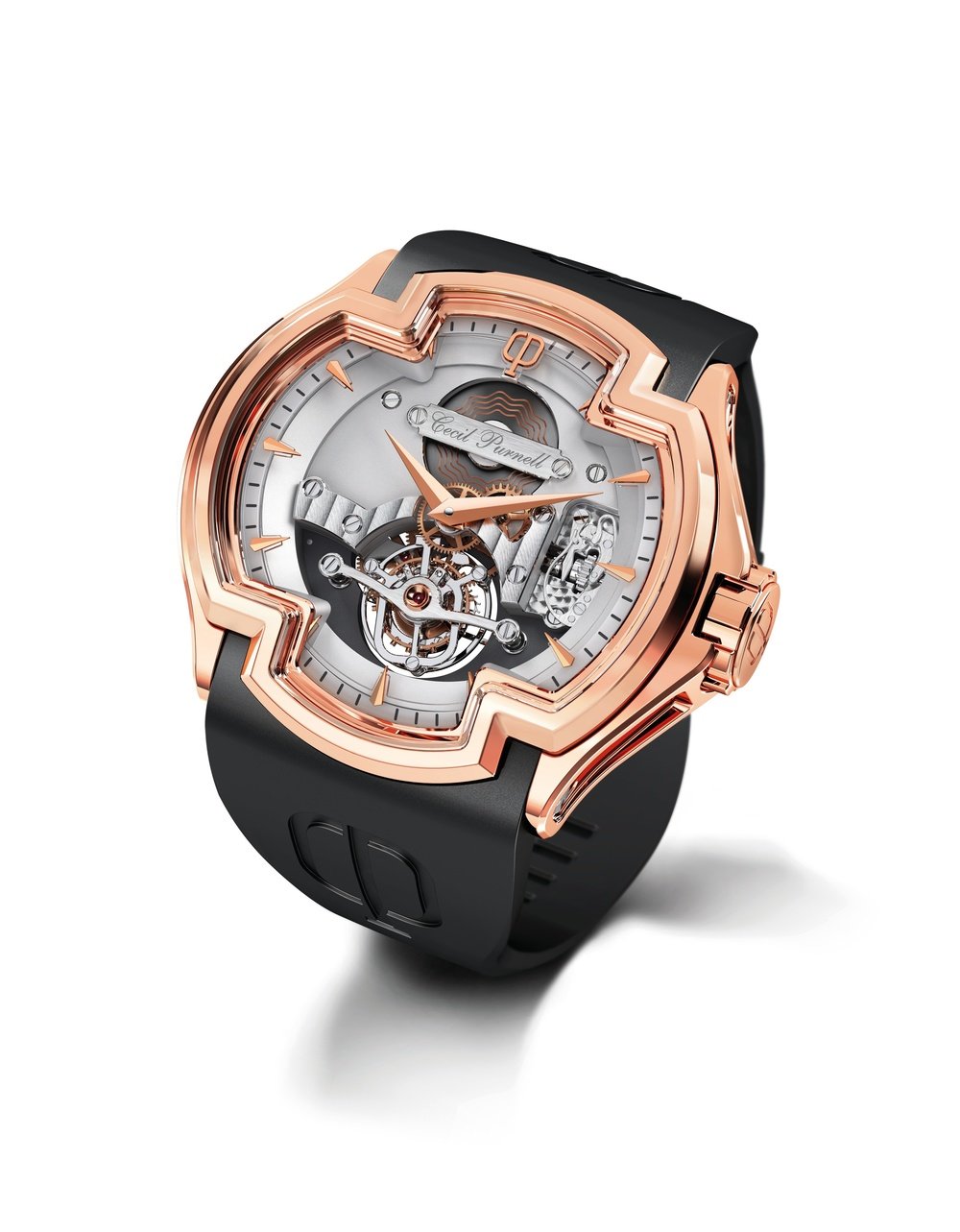The latest creation from Cecil Purnell is a daring watch with a strong, unique design. The brand’s original character, however, is preserved thanks to the dial’s exceptionally pure lines. The tourbillon, the showpiece of the watch, is enthroned in all its splendour at 6 o’clock. Nothing disturbs this perfect balance of detail and transparency, not even the 12 hourmarkers whose tips seem suspended over the open middle. As well as boasting impressive technical credentials, this timepiece is a perfect marriage between savoir-faire and aesthetics.