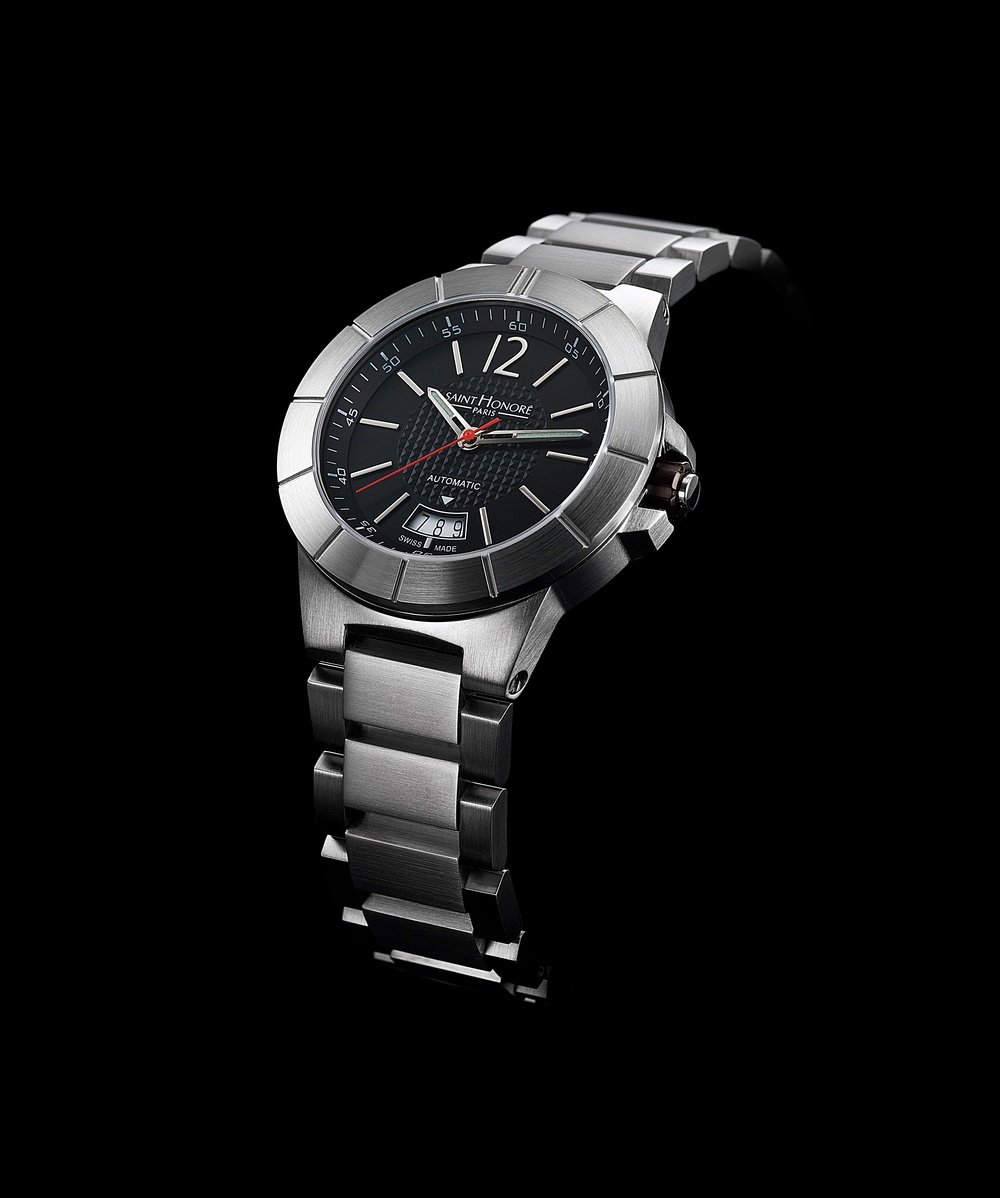 Sleek design, meticulous finish, tempered steel middle…together they have established the exclusive character of the Worldcode watch, launched in 2010 for the brand’s 125th anniversary. The Worldcode is the most masculine symbol of the SAINT HONORE range and a watch of exquisitely harmonious design. The new Automatic version has the added prestige of a mechanical movement with exceptional fundamental qualities. With subtly contrasting tones and polished and brushed steel finishes, the Worldcode Automatic recaptures the watchmaking codes of the Chronograph model with power and virility: 41 mm round case; steel bezel finished in shades of brushed steel, titanium, pink or yellow gold; black or white dials, clous de Paris motif or “carbon” dials for a sportier touch; superbly streamlined metal bracelet. The Automatic version’s unique bezel has cleaner, more modern lines. The Roman numerals found on the Chronograph version give way to a bezel marked only with 12 indexes, with a double at 12 o’clock. Following in the footsteps of the well-loved Chronograph, the new Worldcode Automatic reveals its sophistication and technical prowess through a transparent, screw-down case back which lets an automatic ETA 2824 movement, signed SAINT HONORE, show through beautifully: côtes de Genève décor, oscillating weight gilded in black gold. It is clear that a watch so rife with character will hold strong appeal for men who love sleek elegance and the most striking possessions.