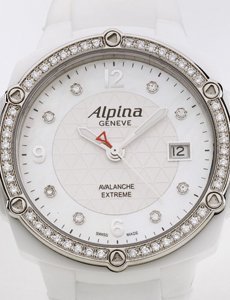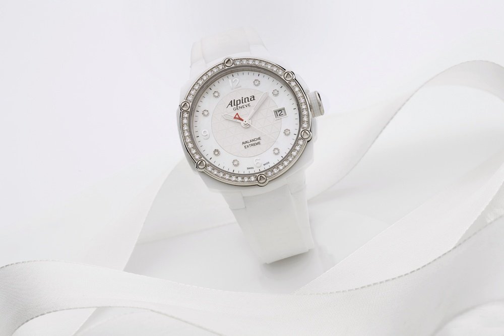 True to its sporting style, Alpina presents the Lady Avalanche Ceramic Collection with its innovative combination of diamonds with white or black ceramic. These strikingly stylish timepieces are designed around four principles: sobriety, technical sophistication, aesthetic, and harmony of colour. In all-over white or black, fifty diamonds illuminate the bezel and the mother-of-pearl dial. Alpina’s signature triangle appears in the delicate guilloché of the dial, and again at the tip of the seconds hand, this time in flamboyant red to accentuate a bold personality. A modern, feminine and sporting creation, exactly like the women who will fall for its charm.