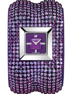 Swarovski revisits one of its first models, this time in purple, the major colour of its Autumn-Winter 2011-2012 collection of accessories and jewellery. A shining example of high-fashion watchmaking, the Elis Bangle comes in right on trend with its cuff bracelet form while the subtle square bezel, cut into a pyramid shape, is borrowed from the original Elis watch. The bracelet’s 744 mini crystals have been intricately set to form an eye-catching wave. The purple dial is a visual statement with an opaline exterior surrounding a satin sunburst centre. The hourmarkers are set with miniature crystals to further enhance the opulent monochrome of this dazzling creation, which Swarovski proposes as a 1,000-piece limited series.