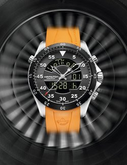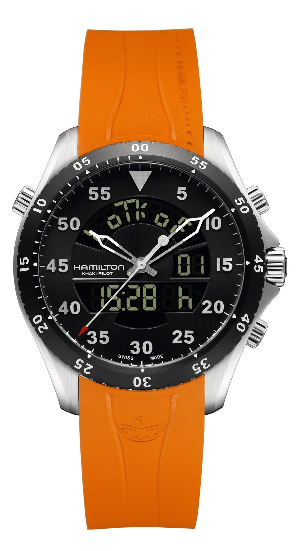 The Khaki Flight Timer, in collaboration with Air Zermatt, the prestigious Swiss helicopter rescue service, takes digital and analogue displays to new heights! This new multifunction pilot’s watch incorporates a personalised logbook that records vital information for 20 flights and up to 99 landings for each. The crown and the pushers give pilots and thrill-seekers access to many useful functions, such as switching between the two digital time zones (SWAP), or synchronisation of the hands with the main digital time. The launch marks the beginning of the official partnership between Hamilton and Air Zermatt, with a commemorative special edition that sports the rescue service’s logo on the back of the case.