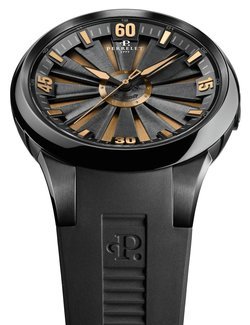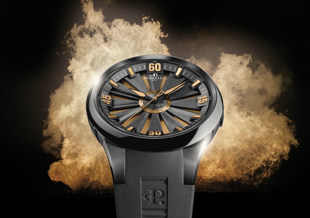 The Turbine Playing with Fire, an 888-piece limited series, plays on gold and its mesmerising shimmer to hint at the heightened passions this metal can inspire in a world of gangsters and molls! The stage is set, with ingots sketched onto the lower dial and a solid gold ring in the centre of the turbine. They are echoed by the gilding on the numerals, hourmarkers and hands. Simply move the wrist for the magic to weave its spell as gold flashes, elusive, from between the twelve spinning blades. The double rotor turns faster and slower with the wearer’s movements, a sight to behold for an iconic timepiece that is impossible to ignore!