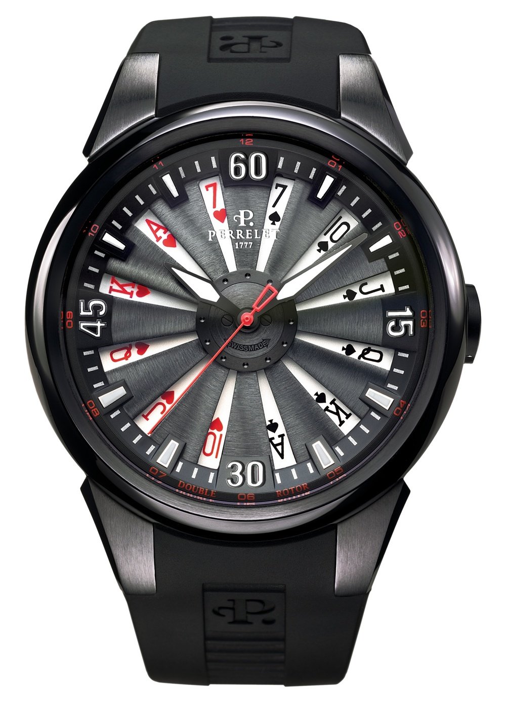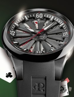 Perrelet deals a winning hand with its signature double-rotor watches, and rewrites the rules of the game with the Turbine Poker. The 12 spinning blades allow tantalising glimpses of the cards underneath, while a flick of the wrist is all it takes to call your opponent’s bluff! This statement watch comes with three versions of the dial. One deals a winning pair of sevens. A second deals a pair of sevens and two royal flushes, one with hearts and one with spades. A third deals two full suits: jacks over sevens and kings over sevens. When the wrist is still, the turbine spins to a halt and finally reveals the cards. Winner takes all!