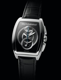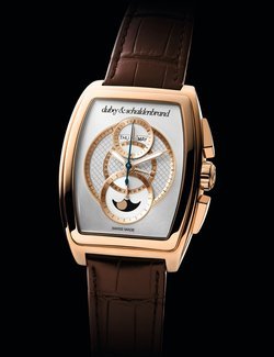 A fresh start for Dubey & Schaldenbrand. Under its owner since 2009, Jonatan Gil, the brand is stepping back into the spotlight with exclusive and resolutely contemporary timepieces, as the Grand Dôme DT eloquently demonstrates. The tonneau case makes its mark with force and elegance. It houses a finely worked Valjoux 7751 calibre. The dial and counters interlace circles of different dimensions with subtly contrasting chequered guilloché and sunray satin finishes. Useful functions – date, day, month, moon phases and chronograph – are vertically aligned for visual balance and at-a-glance legibility.