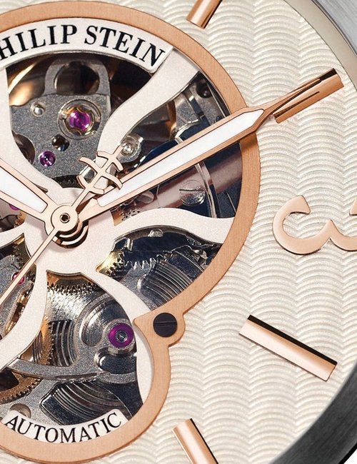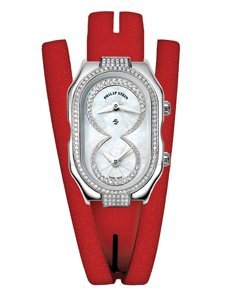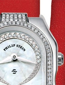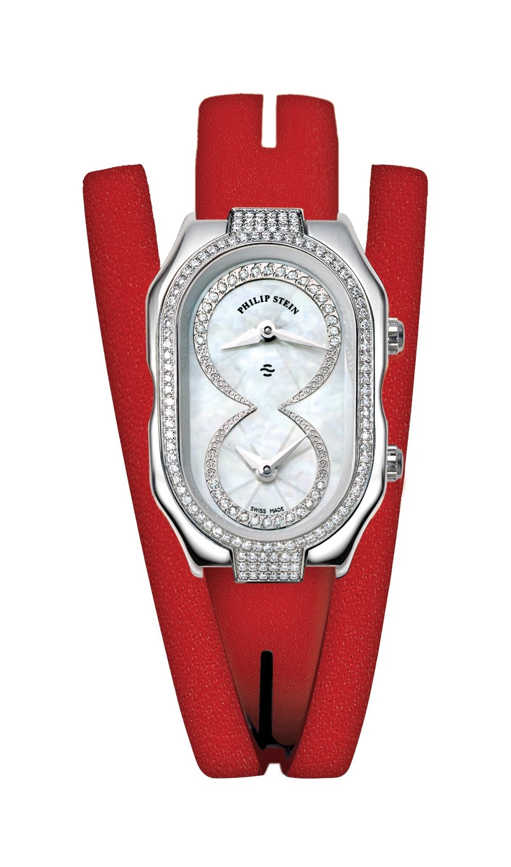 There is more to the Prestige Cocktail watch than meets the eye. Beyond an elegant timepiece showing hours, minutes and a dual time zone, Philip Stein introduces an element of well-being to horological expertise, and equips each of its watches with a “Natural Frequency Disc” – a thin metal plate that helps balance energy flow in the body and increase resistance to stress. And what could be more beautiful than to wrap this holistic technology in a precious timepiece! The natural white mother-of-pearl dial is enhanced with 32 diamonds around the two counters. The bezel, which is set with 112 brilliants, mirrors the curves of the polished steel case and its two crowns, a reminder of the two separate mechanisms inside. A design and values that are the hallmark of a Philip Stein watch.