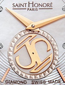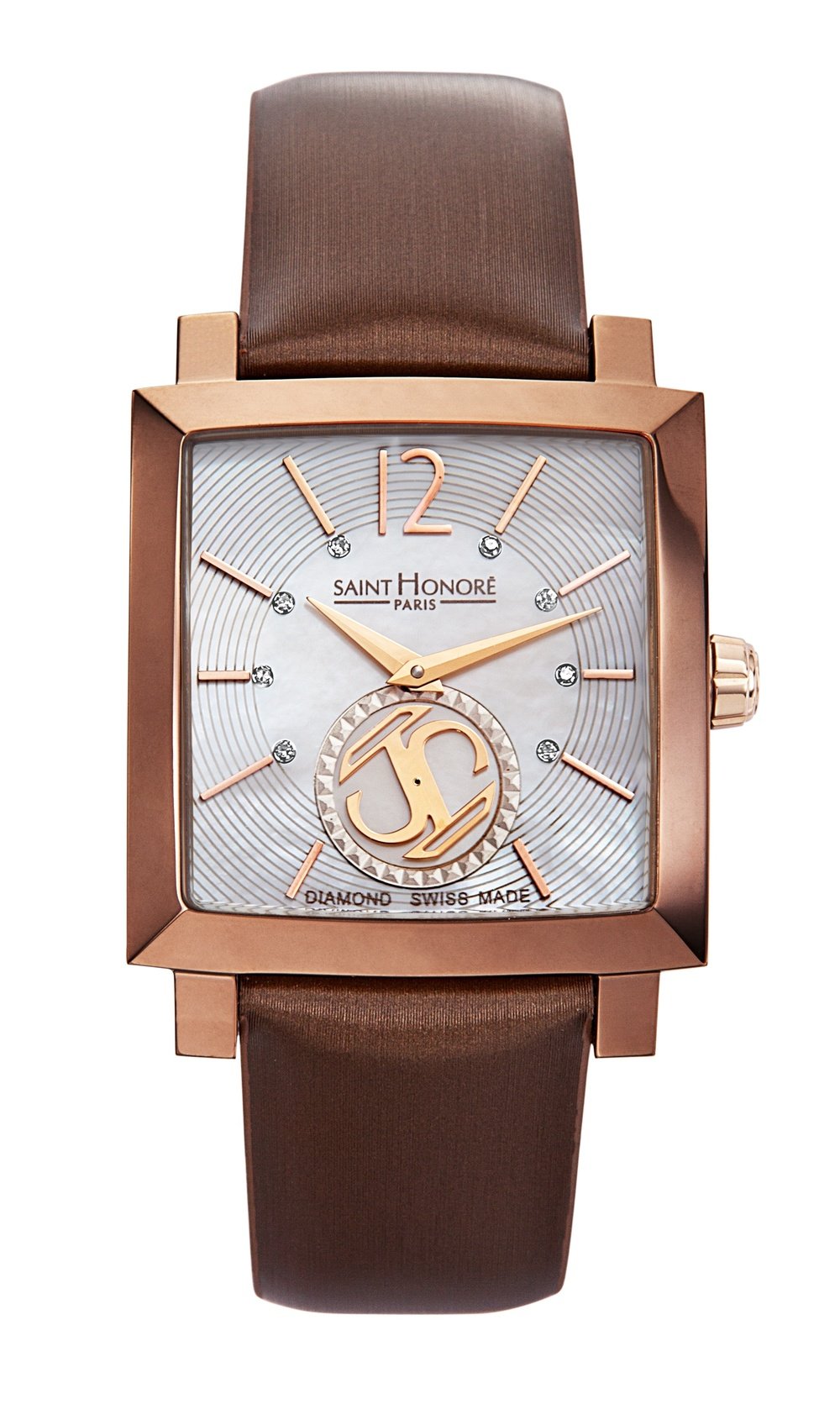 SAINT HONORE introduces a new model to its star collection that has made its mark on the year 2011 : Orsay Lady. Elegance and sensuality are the hallmarks of this precious timepiece, which appears here in its winter dress. Orsay “Bronze” is adorned with a PVD treatment giving it a warm glow that sublimates the curve of its square case. The sparkle of eight diamonds completes the picture by accentuating the hour-markers that appear to be floating on a white mother-of-pearl sea – an effect achieved by the fine circular guilloché dial motif. Lending an additional touch of glamour, the SAINT HONORE monogram elegantly marks off the passing seconds at 6 o’clock as if to emphasise the timeless design of the Orsay Lady collection. The result is a chic and trendy rendering designed for sophisticated contemporary women.