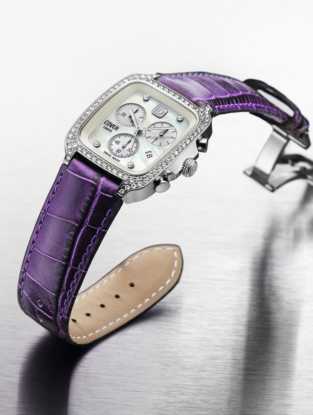 The six models in this new collection from Cover are distinguished by an extremely graceful design featuring soft, flowing lines, as well as richly harmonious colours. These quintessentially feminine and sensual timepieces feature a form case adorned with Swarovski crystals framing a dial adorned in white mother-of-pearl, also enhanced by four crystals serving as hourmarkers. This resolutely glamorous chronograph, driven by an ETA quartz calibre, will delight women by its impressive diversity.