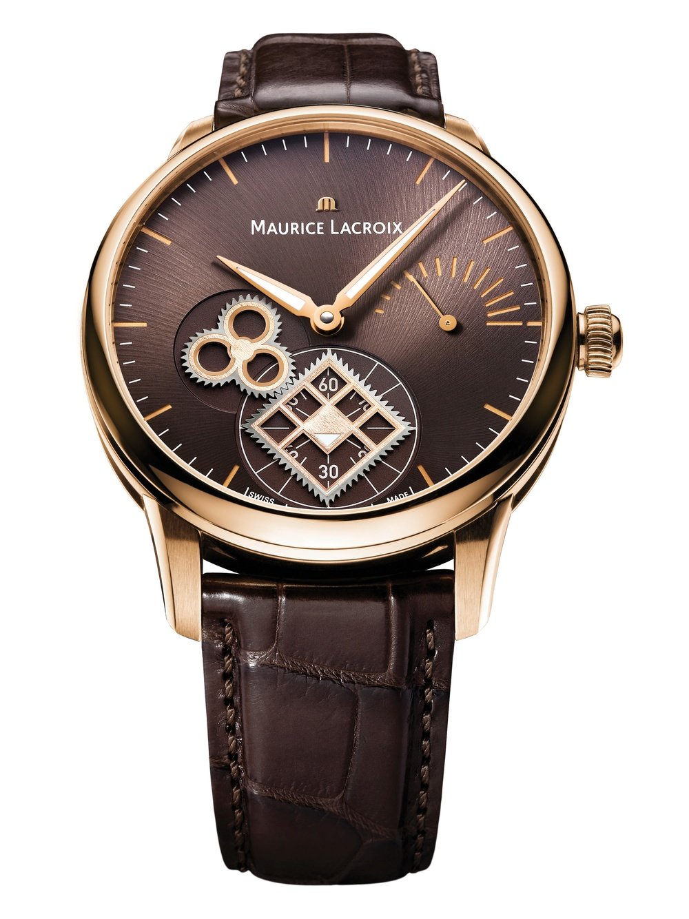 Hand-wound, Maurice Lacroix ML 156 Manufacture calibre, 18,000 vib/h, 34 jewels, rhodium-plated, brown “Grand Colimaçon” decoration, 45-hour power reserve. Patented design (square wheel / clover leaf)