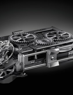 Hand-wound, FLY11 calibre, flying tourbillon inclined at 30°, 21,600 vih/h, 64 jewels, 419 parts, double barrel, 50-hour power reserve, mainplate and bridges in bead-blasted titanium