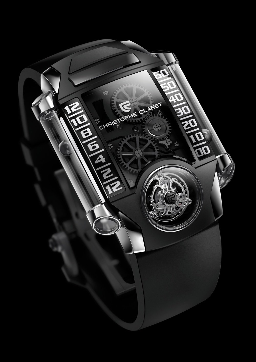 X-TREM. The concept certainly lives up to its name, expressing Christophe Claret’s determination to continue pushing the boundaries of mechanical watchmaking. X-TREM-1, the first model in this new generation of timepiece, represents a technical and aesthetic feat. A flying tourbillon inclined at 30°, fitted on a three-dimensional curvex titanium mainplate, and bearing a retrograde hours and minutes display system radically different from existing watchmaking conventions. Two small steel spheres, hollowed and encased within two sapphire tubes placed to the right and left of the caseband, and with no mechanical connection with the movement, appear to be mysteriously floating through the air thanks to magnetic fields. 8-piece limited edition.