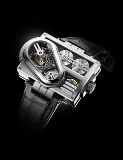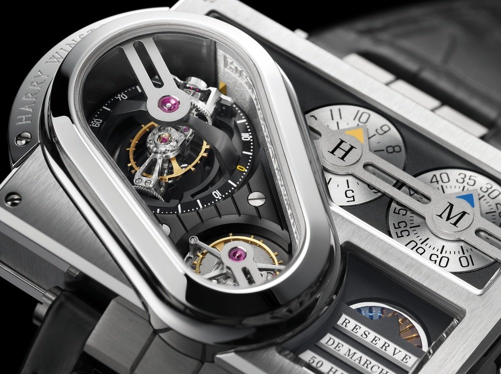 Act 3 in this Histoire de Tourbillon leaves no doubt as to the visionary path taken by this collection, which Harry Winston launched in 2009. Proposed as a 20-piece limited series, Histoire de Tourbillon 3 draws the eye deep into the mesmerising meanders of its perpetually rotating mechanisms, framed by a case in white gold and Zalium®. The dial’s three openings are completely independent yet intimately linked. Resplendent at 9 o’clock is the bi-axial double tourbillon whose outer cage makes a complete revolution in 120 seconds whereas the inner cage makes its revolution in 40 seconds. At 6 o’clock, a single-axis tourbillon rotates in 36 seconds. The off-centre hours and minutes are displayed on two rotating discs, while seconds regularly tick by. The third zone is for the power-reserve indicator, on a disc set with sapphires and citrines. An architecture dictated by avant-garde design, set free by time in all its dimensions.