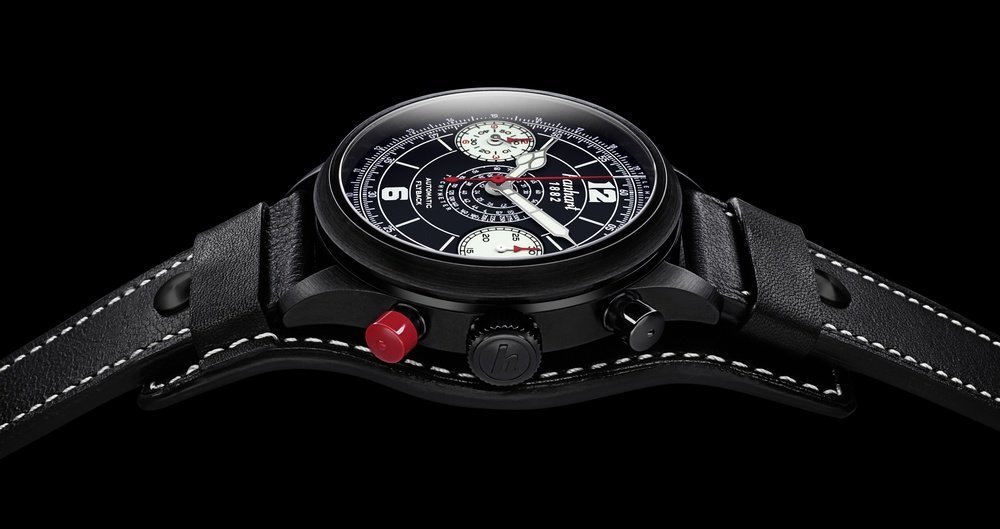 For its 130th anniversary, Hanhart presents the Pioneer Stealth 1882 in two versions, each a 130-piece limited series. This new timepiece is a worthy successor to the brand’s legendary pilot’s chronographs of the 1930s, but with technically and aesthetically noteworthy additions to the dial. The two chronograph counters at 3 and 9 o’clock are positioned at the outermost contour of the imposing dial, thanks to an exclusive reworking of the movement. Furthermore, the disc at 9 o’clock incorporates both small seconds and the 12-hour counter. A flyback function, telemeter scale, tachymeter scale and red pushpiece are the ultimate references to Hanhart’s legendary timers. As for the smooth or fluted bezel… that’s your call!
