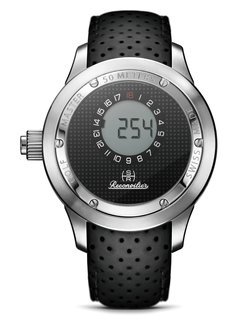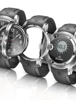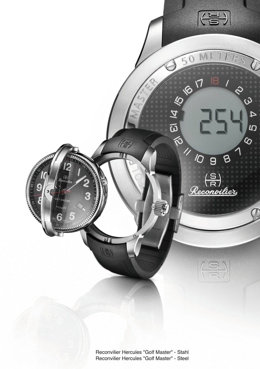 The Hercules Golf Master is the benchmark timepiece for golfers. Its new all-black apparel lends it an even bolder personality. The front shows a traditional three-hand plus date display, while the back reveals a digital read-off instrument. The two sides can easily rotate. With this model displaying distances, front or centre, with measurements in metres or yards, Reconvilier pushes the envelope and revolutionises life on the golf course thanks to its “Caddy”, a GPS receiver which transmits satellite information to the digital module.