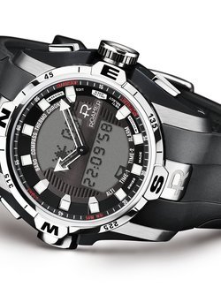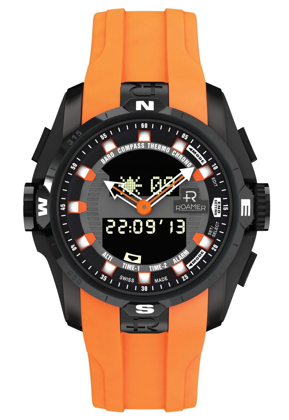Whether on mountain peaks or oceans, in forests or the urban jungle, the new Trekk Master by Roamer is your ultimate off-road companion. The dial combines digital and analogue display and incorporates a compass, an altimeter, a barometer and a thermometer to ensure peerless orientation and preparation. When the compass is activated, the hands point towards the North and the direction is indicated in degrees, underscoring the perfect consistency between the two displays. The alarm, chronograph and second time-zone functions enable them to maintain accurate measurement of time and latitudes. As well as displaying the information, the Trekk Master memorises them. Its vivid and varied colours, its useful functions and its sporting appearance are bound to awaken the adventurer within you!