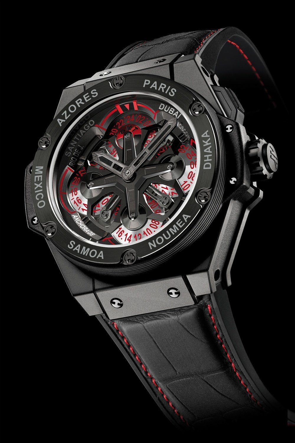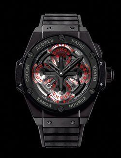 The new famous Unico chronograph movement has been treated to its first evolution, since its base now welcomes a GMT function also entirely developed and manufactured by Hublot. This new complication offers a clever set of 4 rotating aluminium discs indicating the same number of time zones. They are controlled by a pusher housed in the caseband at 2 o’clock and enabling instant and highly legible readings of the time in a choice of 14 cities. The 48 mm case is available in black ceramic or 18K red King Gold versions, and bears the unmistakable architectural Hublot signature. This watch with its sophisticated and functional design should appeal to travellers with a taste for fine contemporary watchmaking.