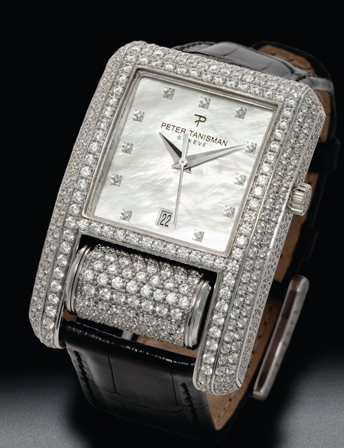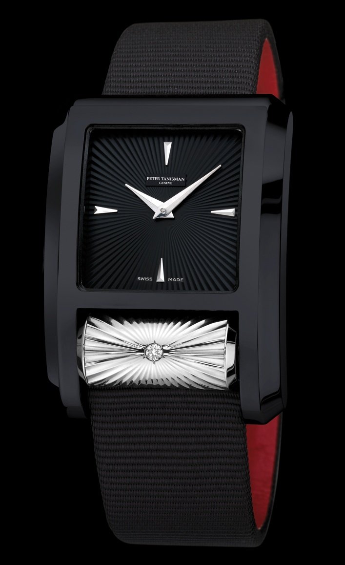 Immediately identifiable by its sheer volume as well as by its fine curving line and unique cylinder, the Carrousel by Peter Tanisman is an authentic work or art. In this “Black Attitude” version, black sets the tone from case to strap, while the monochrome dial is enlivened by the hours and minutes indicated by silver-toned hands. The even more luminous carrousel at 6 o’clock is adorned with a sunburst guilloché motif and set with two diamonds. Finally, to lend an even more glamorous touch to this exceptional interpretation, the black satin strap is lined with red leather – for a divinely feminine result!