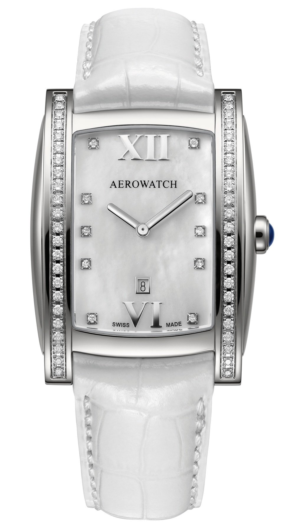 Operation “Idylle” for Aerowatch. This ultra-feminine timepiece promises to set hearts racing! Its delicate 32x35 mm form is the perfect symbiosis between vertical lines and curves: on the one hand, the softly rounded case and the swell of the precious stones; on the other, the rectilinear bezel and striking Roman numerals. The white mother-of-pearl dial offers irresistible purity and perfect legibility of the hours, minutes and date… precisely what today’s woman expects. The bezel and the dial are ablaze with 56 diamonds. Here is a watch that plays with sparkle like a woman plays with time.