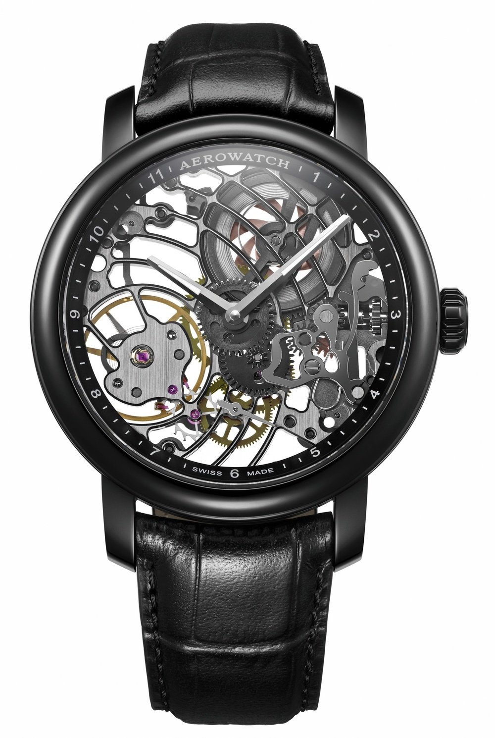 With its statement looks and the imposing diameter of its black PVD steel case, the Renaissance Black Tornado - even this finely skeletonised - doesn’t go unnoticed. The architecture is modern, with fine circular chasing on the black NAC-coated movement. The dial has been removed to reveal the mainspring’s fascinating coils, and the rotation of the different wheels as they mesh. Technical, elegant and contemporary, this new creation from Aerowatch appeals as much to aficionados of authentic mechanisms as to fans of finely-crafted Swiss watches at an attractive price.