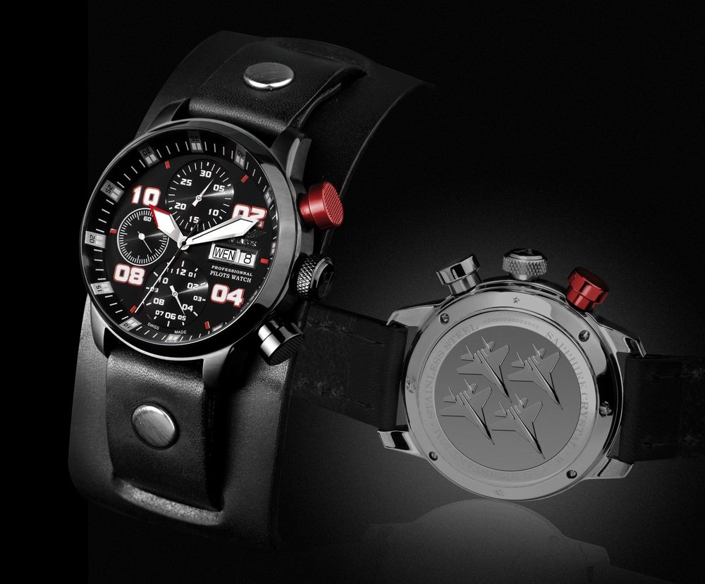 Aviator presents Professional, a collection inspired by aviation and, most importantly, approved by professionals around the world after being put through its paces in the most extreme conditions. This ruthless testing has earned the collection a place on the instrument panel of the Russian MiG-29 “Fulcrum” jet fighter. Such a responsibility dictates the chronograph’s layout as well as a design intended to enhance functionality. Hourmarkers and hands are luminescent, counters are read at a glance, and a large red pusher at 2 o’clock starts and stops the chrono: clearly, no room for error. Black from head to toe, Professional is focused on functions, not distracted by colour. This is a professional-grade chronograph at an attractive price that will seduce fans of masculine watches. Including those with their feet on the ground!
