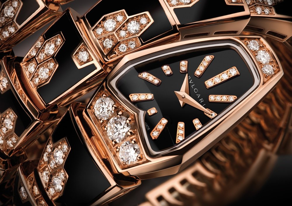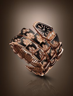 The Serpenti by Bulgari has, for years, left its mark on the world of jewellery and watches. Time after time, this icon among wristwatches brilliantly reinvents itself. This new interpretation colours its scales with jet-black enamel then sets them with brilliant-cut diamonds. This marvel among watches unfurls its diaphanous pink gold coils twice around the wrist and deploys a total of 385 precious stones. The bracelet extends to form the case, which becomes this mysterious reptile’s head. It houses a personalised quartz movement and is encrusted top and bottom with six brilliant-cut diamonds. They flank a black sapphire dial whose 12 hourmarkers are also set with 33 diamonds. Serpenti: a history, a legend, a signature.