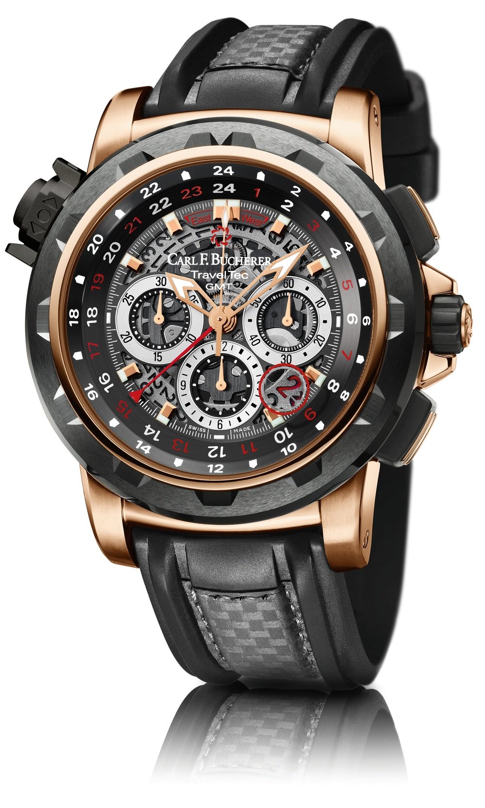 A bold concept underlies the Patravi TravelTec FourX: 1 watch, 3 time zones, 4 materials. Already in 2006, Carl F. Bucherer proved itself capable of resolving this ambitious equation with a technical tour de force. In 2012, it proposes an exquisite and unexpected combination of 18k pink gold for the case, ceramic for the bezel, rubber for the crown and pushers, and titanium for the monopusher. A masterpiece of engineering on an astonishingly small scale.