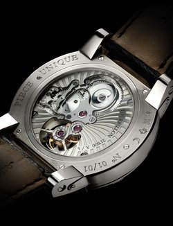 Mechanical hand-wound, exclusive tourbillon, 3 Hz, 14 ½ lines, 19 jewels, 21,600 vib/h, lateral lever escapement, winding mechanism with “octopus” spring visible on the caseback, 72-hour power reserve, “Côtes du Jura” finish