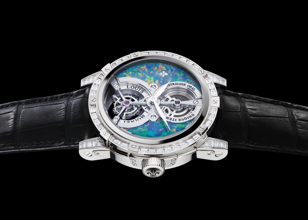 The Louis Moinet world tour continues! Its new concept of unique “Treasures of the World” models now takes us to Australia. In association with Daniel Haas, world-famous specialist and artisan in the field of precious stones, Jean-Marie Schaller travelled the globe looking for the finest gems. They now offer a journey to the land of wallabies with the Vertalis Tourbillon Australian Opal watch featuring a dial adorned with the famous stone with its fiery colours and iridescent sparkle. Sourced directly from the Olympic mine, this ultra-rare crystal opal boasts some truly extraordinary reflections. Presented in a white gold case with a bezel set with 56 baguette-cut diamonds, this one-of-a-kind model associates the distinctive vibration of opal with the mechanical beauty of the tourbillon. An outstanding exclusive model from Louis Moinet.