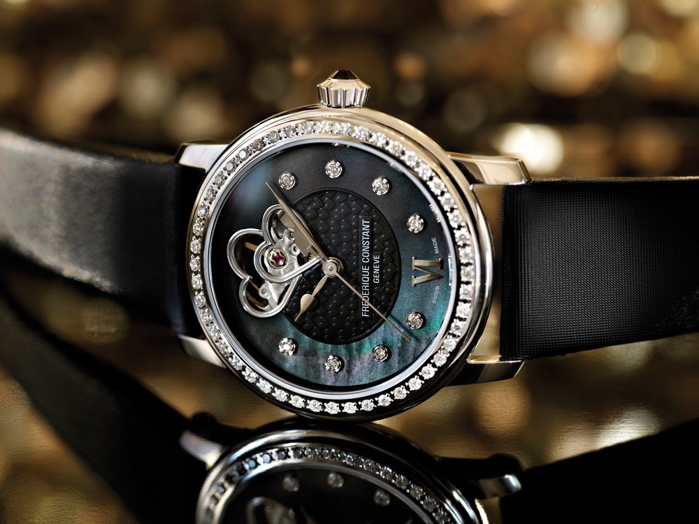 Frederique Constant presents Black Beauty. This elegant new interpretation in the Heart Beat collection once again lends full significance to the expression, “the movement’s beating heart.” A hallmark of the brand, two openworked, interlacing hearts in the dial offer a glimpse of the automatic movement. The black mother-of-pearl dial with shimmering blue accents, the diamonds that circle the bezel, and the satin strap add the final touch in reflecting the values and aspirations of women today.