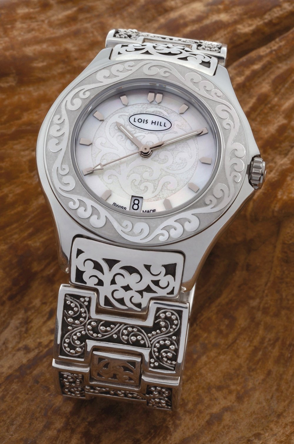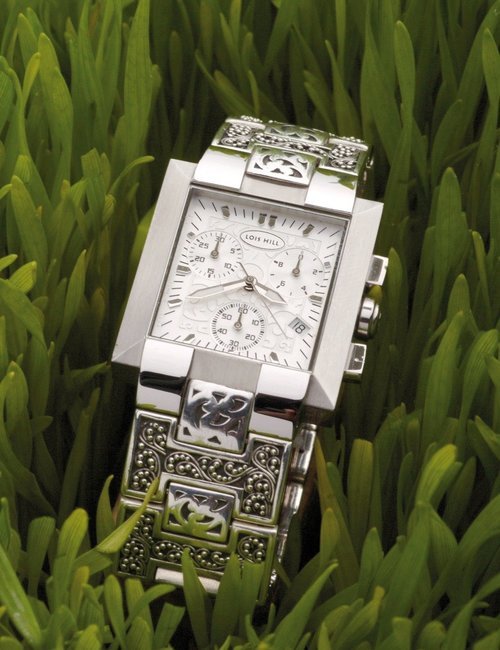 Welcome to the world of Lois Hill. With the launch of the 6156, the designer continues to explore the world and its cultures, fuses age-old crafts with modern technologies, and transforms this unique melting-pot into her signature. She has imagined a steel case whose bezel is embellished with engraved filigree floral patterns. This elegant decoration spills over onto the horns and silver dial. The sterling silver bracelet confirms this attention to detail with links whose granulated effect has been created by hand. The finished piece is as much adornment as watch, conveying Lois Hill’s vision of jewellery and timepieces as one.
