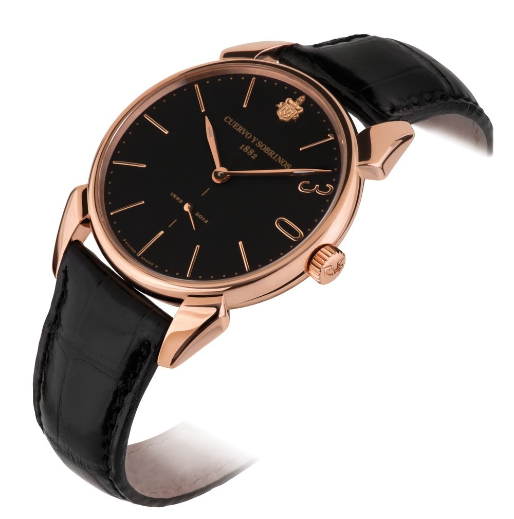 Prestigious watchmaker Cuervo y Sobrinos celebrates its 130th anniversary with the Historiador Pequeños Segundos 130° Aniversario. This splendid, extra-thin timepiece in pink gold instils Swiss quality with Latin soul. It is also a heartfelt tribute to Havana, the birthplace of the brand and a bustling city where, in the early 19th century, intellectuals rubbed shoulders with seafaring adventurers. Cuervo y Sobrinos commemorates this milestone with a classic timepiece characterised by studied sobriety: an ageless masterpiece. The movement is hand-wound, the dial velvety black. Seconds sweep a counter at 6 o’clock, flanked by the years 1882 and 2012. The first three hours are materialised by the symbolic numerals 1, 3 and 0. A shining tribute to as many years of horological tradition, Latin-style. Proposed as a 130-piece limited series.