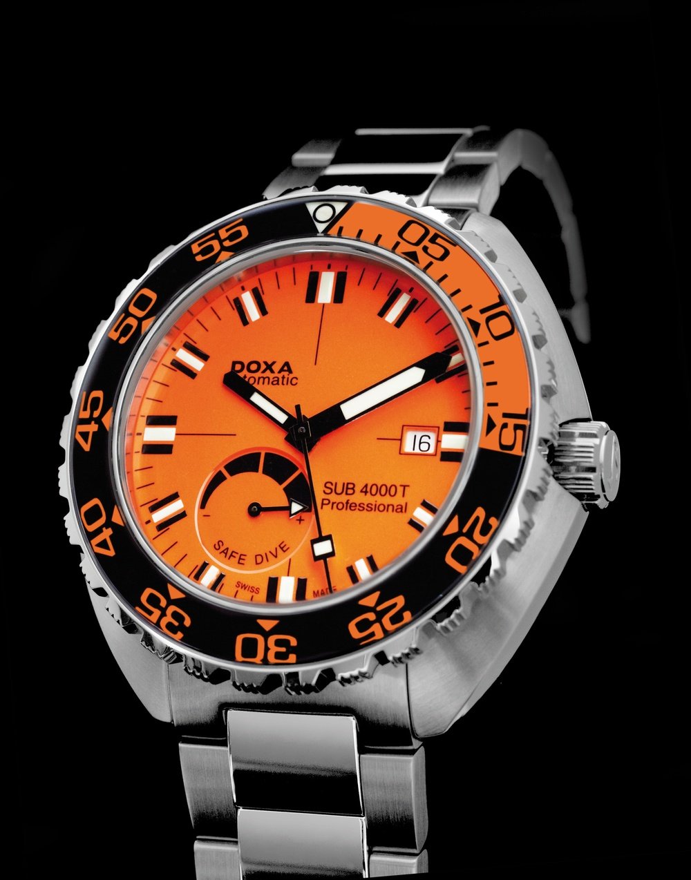 Joining the SUB 4000T collection, the latest dive watch from Doxa comes equipped with a sapphire crystal bezel. Unidirectional, as professional dive watch standards require, it indicates decompression stops in feet to guarantee performance and security in the most extreme conditions. Seasoned divers will also appreciate the luminescent hourmarkers and hands, the helium valve at 9 o’clock, and water-resistance to 1,220 metres. Not to mention its sporty good looks! Proposed as a 200-piece limited series.