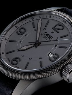 A perfect embodiment of the Oris style, the new Big Crown Date combines aesthetic refinement with a resolutely technical touch, while remaining loyal to its premier inspiration: aviation. This timepiece is distinguished first and foremost by its unique dial. The 3D hourmarkers and numerals are composed of small dark Superluminova blocks that stand out in an original way against the “stealth grey” dial background. Aviation enthusiasts will note the resemblance between its bold styling and that of stealth planes. The grey PVD-coated steel case and Big Crown knurled bezel also adopt the aesthetic influence of military aircraft. The dark brown leather strap sets a simple yet elegant finishing touch making a fine match with the dark grey case and dial, thereby accentuating the contemporary, urban look of this timepiece.